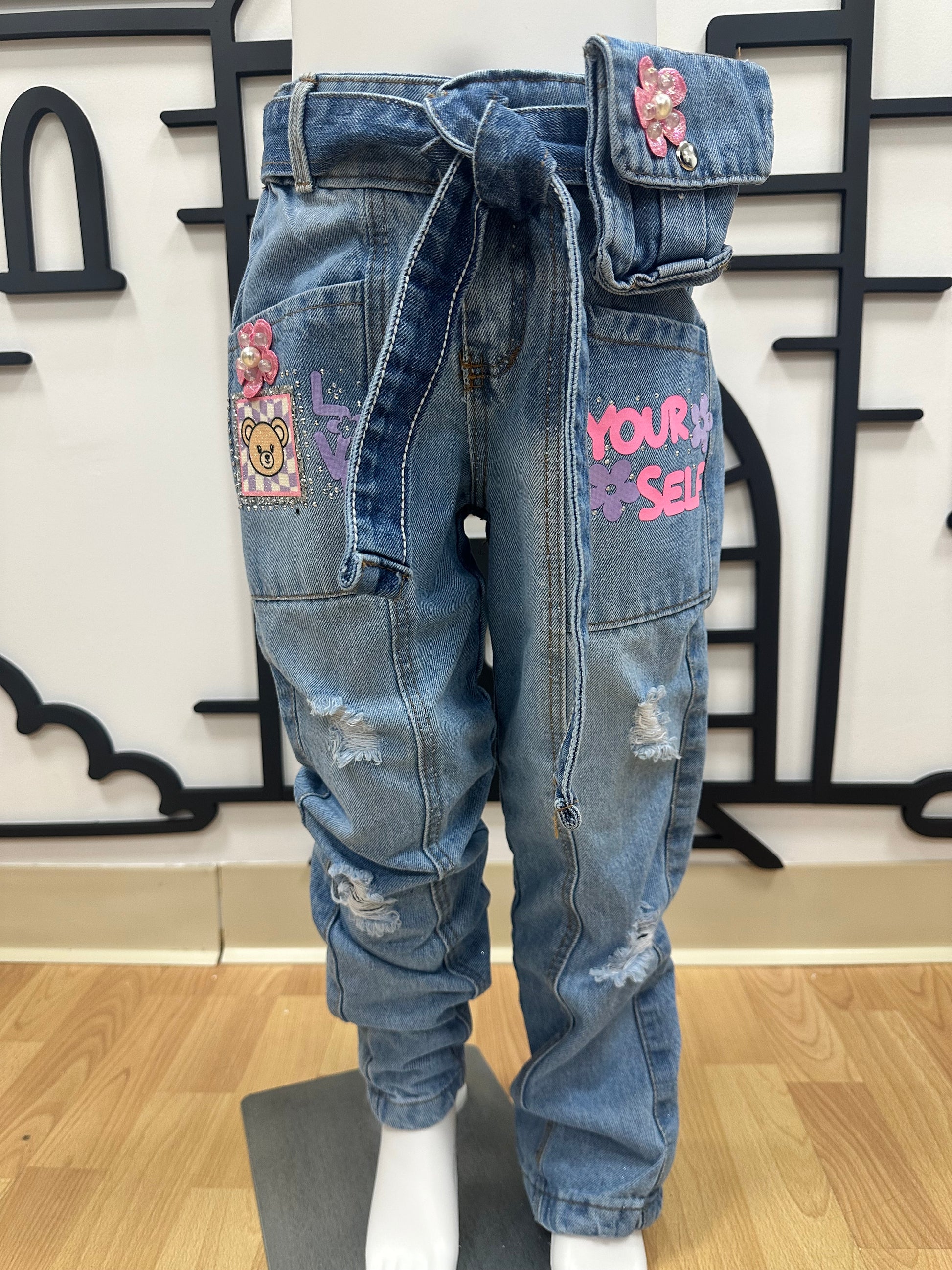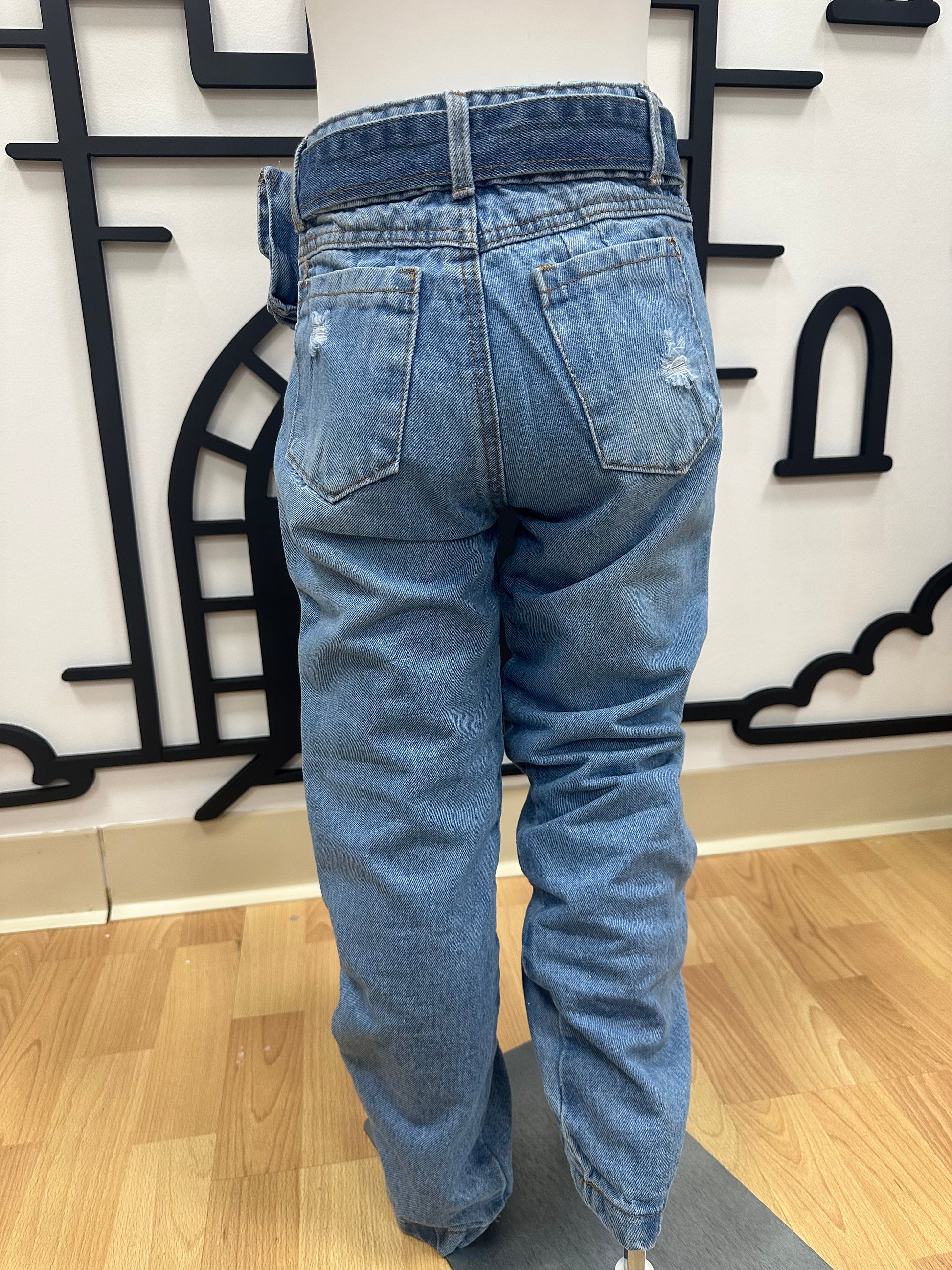 Mahón largo rigido. Trae cinturón y cartera. Detalles en perla, brillo, “roto”. Es ajustado en la cintura. Corre hasta dos tallas menos.
