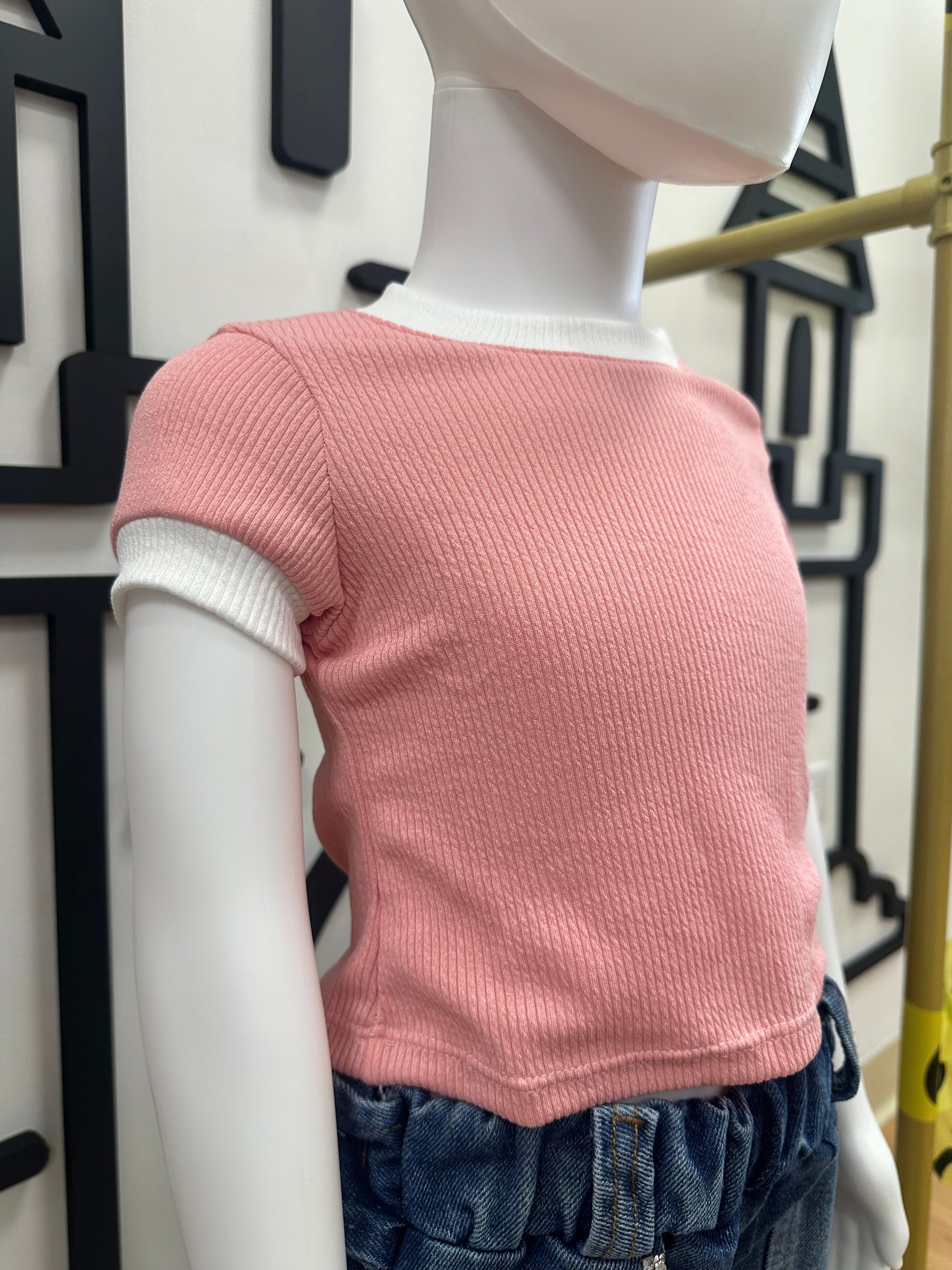 Blusa color rosa con cuello y mangas blanco. Queda un poco pegada al cuerpo y no es larga (como top). Fresca. Corre bien. Color que combina con todo.